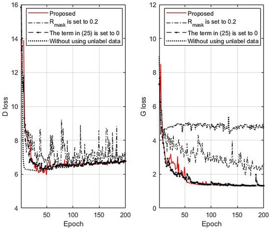 Figure 4 compares the losses of the discriminator and generator in four SM-ACGAN cases when . The first was the case using the proposed SM-ACGAN. The second was the case where SM-ACGAN was used when of Equation (20) was set to a fixed value of 0.2. The third was the case where SM-ACGAN was used when the term in Equation (25) was set to zero. The fourth was the case of using SM-ACGAN without data augmentation, which meant that unlabeled data and labeled fake data generated by the generator were not used for the training. It can be seen from Figure 4 that the losses of the discriminator and generator in the first SM-ACGAN case converged far faster and more stably than the losses of the discriminator and generator in the second SM-ACGAN case. This result implies that varying the masking ratio according to Equation (20) can make training of the discriminator and generator more stable than when using a fixed masking ratio. The generator loss of the first SM-ACGAN case converged faster and more stably than the generator loss of the fourth SM-ACGAN case. This result implies that data augmentation with unlabeled data and labeled fake data generated by the generator can stabilize the generator training. For epoch numbers larger than 100, the loss variances of the discriminator and generator in the first case were 0.0043 and 0.0013, respectively, whereas the loss variances of the discriminator and generator in the third case were 0.0082 and 0.0064, respectively.