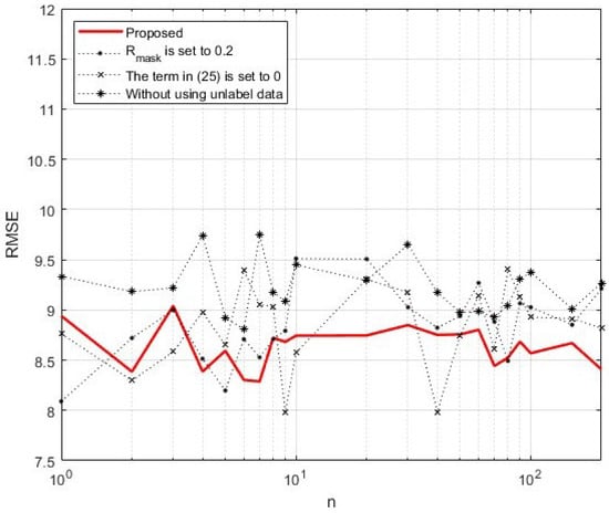 For simulations, we assumed that , , , , , and . Note that n is a positive integer that represents the number of mini-batch data groups. With these settings, the number of labeled data required for training and validating (i.e., ) can be expressed as .