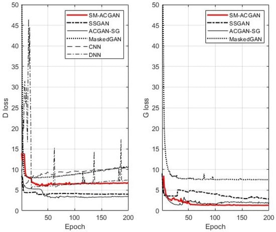 Figure 6 compares the losses of the discriminator and generator of SM-ACGAN with those of ACGAN-SG, MaskedGAN, SSGAN, the CNN, and the DNN when . It can be seen that the discriminator loss of SM-ACGAN tended to converge much faster and more stably than those of the CNN, DNN, and MaskedGAN. It can also be seen that the generator loss of SM-ACGAN converged much faster and more stably than that of SSGAN and ACGAN-SG. When and the epoch number was greater than 100, the loss variances of SM-ACGAN, ACGAN-SG, MaskedGAN, SSGAN, the CNN, and the DNN are summarized in Table 8. Evaluating the results given in Table 8, we can see that SM-ACGAN had a more stable learning process than ACGAN-SG, MaskedGAN, SSGAN, the CNN, and the DNN in situations where labeled training data were limited.