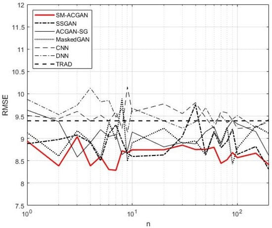 Figure 7 compares the mobile speed’s RMSEs of SM-ACGAN with those of ACGAN-SG, MaskedGAN, SSGAN, CNN, DNN, and TRAD. From the figure, we can see that SM-ACGAN had an overall lower RMSE along the n-axis compared to other machine learning methods. The RMSE of TRAD showed an average RMSE result of 9.3944 on the n-axis. It can be seen that SM-ACGAN had better mobile speed measurement performance than TRAD even in situations where labeled training data were limited. The means and variances of the RMSEs from SM-ACGAN, ACGAN-SG, MaskedGAN, SSGAN, CNN, and DNN are shown in Table 9. It can be seen that SM-ACGAN had the smallest RMSE mean and the smallest RMSE variance when compared with ACGAN-SG, MaskedGAN, SSGAN, CNN, and the DNN. This indicates that the proposed SM-ACGAN can achieve higher accuracy and greater robustness than other machine learning methods when measuring mobile speed with limited labeled training data.