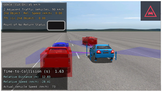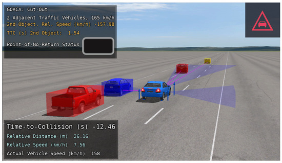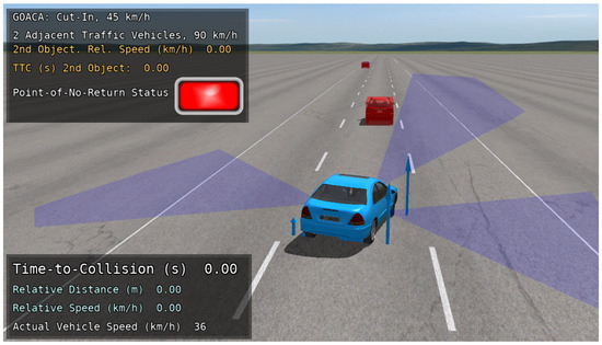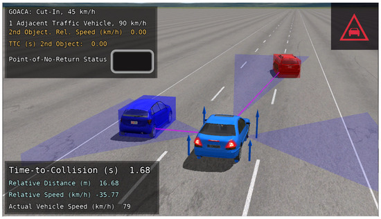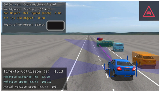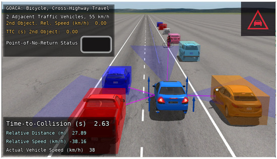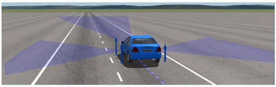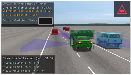 The autonomous vehicle (AV) used in the GOACA tests within this manuscript is the E-Class sedan, rear-wheel-drive, without ABS or ESC. One feature that was added for the AV was the addition of a left-facing and right-facing sensor that can be thought of as a camera sensor with computer vision capabilities. The computer vision capabilities are shown in the sensor’s ability to detect multiple object types including cars, bicycles, and pedestrians. These sensors were added so that the AV can detect secondary AROs in adjacent lanes in the form of traffic vehicles. The original front-facing sensor in addition to the left and right-facing sensors can be visualized in location and field-of-view on the AV in the CarSim Visualizer (animation) (Figure 5).