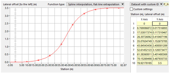 The target TTC between the AV and ARO upon the ARO’s encroachment into the lane of the AV helps determine where the ARO should start the scenario relative to the AV and at what time the ARO should begin its Cut-In maneuver. An example of the geometric path used for the Cut-In ARO can be seen in Figure 7 which was used for the 120 km/h AV initial speed scenario.