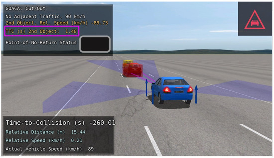 One AV behavior mode that yielded a successful run with traffic came when the AV was slowing down upon the Cut-In or Cut-Out-and-Reveal events. At these moments, the AV slowed enough that the traffic vehicles passed the AV. As a result, the adjacent lane was open for the AV to perform a lane-change maneuver. This can be seen with the 90 km/h Cut-In test with two adjacent traffic vehicles with the initial braking during the ARO Cut-In and adjacent traffic detection (Figure 20). A lane change maneuver is conducted after the AV perceives that the adjacent lane is vacant (Figure 21), and successfully returns to the original lane behind the original ARO (Figure 22). The AV is behind the ARO by the time it returns to the original lane because of the significant speed reduction the AV performs while waiting for the adjacent traffic to pass before conducting the emergency obstacle avoidance maneuver. The negative sign in front of TTC in Figure 21 occurs when the AV begins making the lane change maneuver and the forward-facing sensor detects the adjacent lane car. In this case, the absolute value of the displayed value is the TTC to the adjacent lane vehicle.