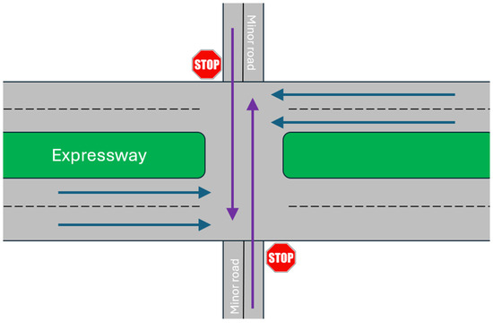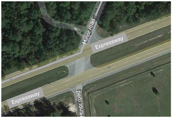 Scenarios meant to emulate AV travel on a divided four-lane rural highway with two lanes of forward traffic per side were also included in the GOACA test matrix (Table 3). These divided rural highways can include a median and intersections which allow for traffic to travel perpendicular to the main four lanes, to either enter the highway’s main flow or get from one side of the highway to the other [30,31]. A top-down view of this type of rural highway including an intersection, along with entrance and exit lanes, and noted directions of travel can be seen in Figure 13. An example of this type of divided rural highway with an intersection can be seen in Figure 14. The intersection scenario in Figure 13 and Figure 14 is a high-speed case as the AV under consideration is on the main road and is driving at highway speed.
