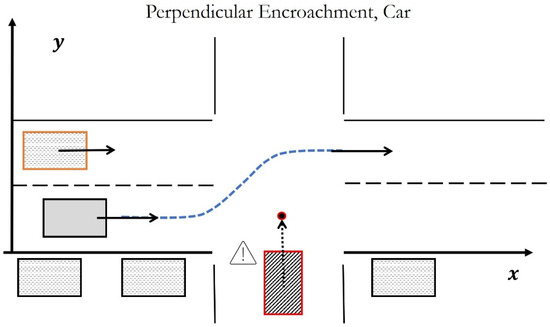 AVs traveling at highway speeds need to follow the target vehicle on the same lane at a comfortable and safe time gap [33]. If the vehicle in front has very sudden deceleration, or in the presence of cut-in and perpendicular encroachment type situations, a collision avoidance system is needed. There are many papers that have considered collision avoidance with other vehicles and vulnerable road users. The elastic band approach was used in [34] to avoid collisions with other cars and involved braking and lane changing, including oncoming vehicles on the change lane. The elastic band method is applied to vulnerable road user safety and the socially acceptable distance concept is introduced in reference [35]. Lane changes were not used in [35] as the AV traveled alongside the vulnerable road user. While adjacent lane traffic has been considered in papers; for example, on lane changing systems [36,37,38], it has not been considered in the assessment methodology of AV obstacle avoidance maneuvers and is, thus, a contribution of the present work.