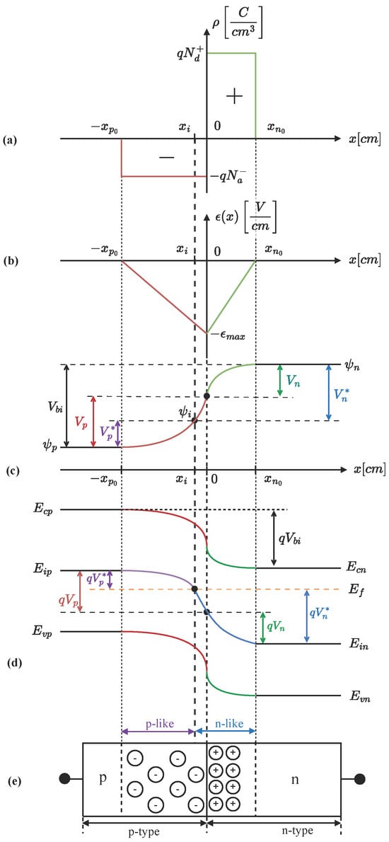 The basic theory of ideal p-n junctions in equilibrium treats the space charge region (SCR), or the depletion region, under the assumptions that (i) the junction is abrupt and (ii) the junction is depleted of free electrons and hole carriers, by neglecting the carrier concentration in the depletion region. In addition, the regions outside the SCR are assumed to be quasi-neutral with local charge neutrality and a zero electrical field [1,2,3,4,5,6].
