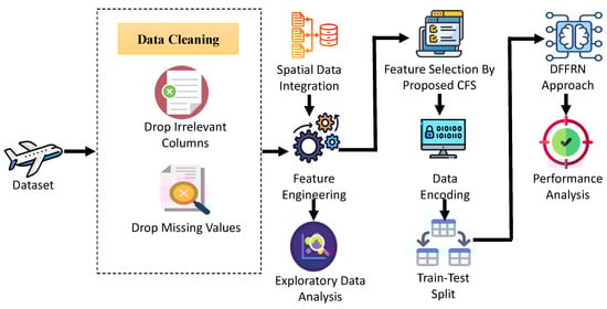 This study presented a comprehensive approach to flight delay prediction, starting with data cleaning and preprocessing to ensure data quality and integrity. After refining the dataset, we proceeded with Exploratory Data Analysis (EDA) to uncover key patterns and trends impacting flight delays. This phase involved analyzing delays across different states, exploring the relationship between departure and arrival delays, and examining seasonal, hourly, and day–night trends. These insights established a foundational understanding of delay patterns, which informed our subsequent feature engineering and selection strategies. We applied advanced spatio-temporal feature engineering to enrich the dataset, capturing crucial spatial and temporal dependencies in flight delay dynamics. This enabled the model to account for regional and time-based variations, further enhancing predictive accuracy. To streamline the input data and improve efficiency, we proposed a novel Correlation-Based Feature Selection (CFS) algorithm. This algorithm effectively reduced the feature set from 50 to 36, achieving an approximately 50% reduction in RMSE while maintaining high accuracy. The CFS algorithm’s ability to retain only the most predictive features not only boosted model performance but also optimized computational resources, underscoring its practical value. Among the various models tested, our proposed DFFRN model stood out, achieving superior performance metrics, including a test RMSE of 1.672 and an score of 99.916%. These results demonstrate DFFRN’s robustness and precision in predicting flight delays, particularly when paired with our spatio-temporal feature engineering and CFS algorithm. This combination significantly enhanced predictive power, making DFFRN a reliable tool for delay prediction in complex aviation contexts. Looking ahead, we plan to expand this framework by developing a real-time flight delay monitoring system, allowing for immediate, data-driven insights for stakeholders. We will also explore more sophisticated feature selection algorithms to adapt dynamically to changing conditions, further enhancing predictive accuracy and applicability. This research lays the groundwork for integrating predictive analytics into aviation management, offering a powerful approach to flight delay forecasting that balances accuracy, efficiency, and practical relevance for real-world applications. Moreover, we also plan to incorporate weather-related features by integrating external meteorological datasets to enrich the input data and address the current limitation of missing weather-related variables. This will allow us to evaluate the impact of adverse weather conditions on flight delays more comprehensively.