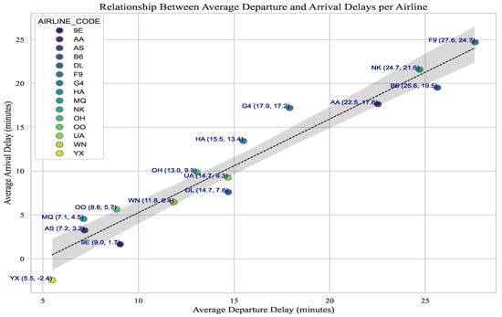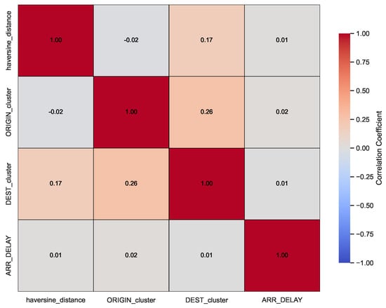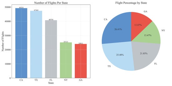 To enhance our analysis of air delays, we integrated geographical coordinates (latitude and longitude) for both origin and destination airports by merging airport data (https://pypi.org/project/airportsdata/ accessed on 6 December 2024, License: MIT License (The MIT License (MIT) Copyright (c) 2020-Mike Borsetti)). The transformation for adding geographical coordinates can be expressed mathematically. Let represent the airport data and the main dataset. The merging operation for origin and destination airports can then be defined as follows: