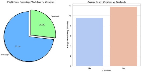 To differentiate between weekend and weekday flights, we created a binary feature that is set to 1 if the flight occurs on a Saturday or Sunday, and 0 otherwise. This feature captures differences in flight patterns, as weekends may experience different traffic volumes and operational schedules compared to weekdays. Mathematically, this feature is defined as follows: