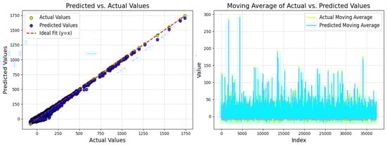 To assess our suggested model’s prediction accuracy, we performed an analysis comparing the actual and predicted values through visualization. Figure 14 provides a two-part visual analysis, showcasing both a scatter plot for actual vs. predicted values and a line plot of their moving averages. The scatter plot on the left illustrates a reliable linear correlation between anticipated and real values, indicating a high score and demonstrating the model’s precision. The ideal fit line (y = x) aligns closely with the data points, underscoring the model’s accurate predictions. On the right, the line plot of moving averages further supports the model’s consistency, with the predicted moving average closely tracking the actual values. This visualization highlights the model’s effectiveness in producing reliable predictions across various data points.