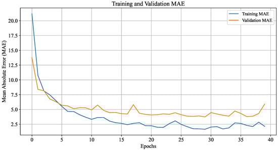 The proposed model exhibits significant overfitting when trained on a small dataset, as seen in Figure 15. The training MAE steadily drops, whereas the validation MAE rises after a certain point, indicating that the model is fitting too closely to the training data and learning noise rather than generalizable patterns. This leads to poor performance on the validation set, highlighting the overfitting issue.