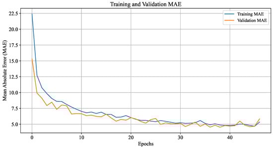 To solve this issue, regularization approaches such as L2 regularization and dropout were used during training. L2 regularization penalizes high weights, whereas dropout keeps the model from becoming unduly reliant on certain characteristics. These changes resulted in a more stable training–validation curve (Figure 16), with the validation MAE no longer growing after a given epoch, indicating enhanced generalization and performance.