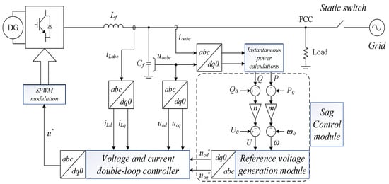 Droop control strategies firstly rely on instantaneous power theory to calculate the active and reactive power generated by the inverter, thereby controlling the voltage magnitude and frequency of its output to satisfy the droop characteristic relationship [,,,]. Through the implementation of droop control, the diverse energy storage devices within the microgrid system can accomplish rational power allocation, thereby sustaining system equilibrium, reliability, and flexibility. Simultaneously, it optimizes the utilization of available energy resources, all without the necessity for additional communication coordination devices [].