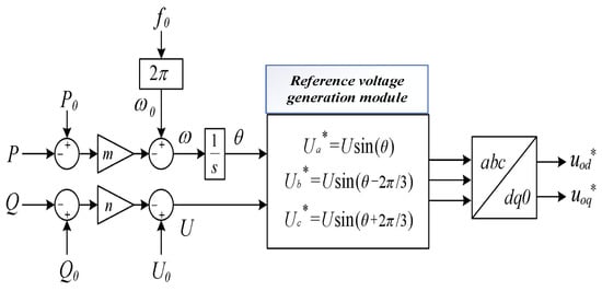 The control method of the droop curve is as follows: the droop curve is used to map the P and Q obtained from the instantaneous power calculation link, and then ω and U are obtained. The reference voltage required for the next link is generated according to the known voltage amplitude and frequency values. The formula for the reference voltage generation module is as follows: