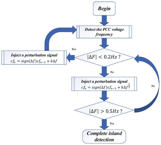 The specific process is as follows: The microgrid system constantly monitors the PCC voltage frequency. If the detected frequency difference from the grid frequency is less than 0.2 Hz, it indicates that the PCC voltage frequency fluctuation is within the safe range and the probability of islanding is low. At this point, a disturbance signal is injected into the output current of the energy storage converter. If the detected frequency difference from the grid frequency is greater than 0.2 Hz, it indicates that the PCC voltage frequency fluctuation has exceeded the safe range and the probability of islanding has significantly increased. At this point, a disturbance signal is injected into the output current of the energy storage converter to increase the feedback value and accelerate islanding detection. If the detected PCC voltage frequency is less than 0.5 Hz, the relationship between and 0.2 Hz is re-evaluated until a frequency error of no less than 0.5 Hz is detected, at which point the occurrence of islanding is determined.