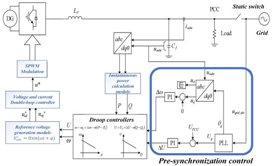 - Liang, M.; Cai, X.; Gong, L.; Wang, B. Research on grid-connected pre-synchronization control of microgrid based on droop control. Comput. Simul. 2022, 39, 80–86+109. [Google Scholar]