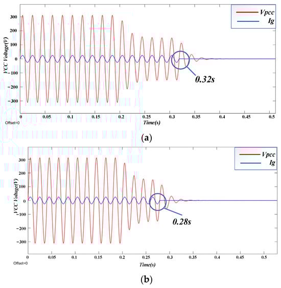 Islanding detection waveforms: (a) Waveform using traditional AFD methods; (b) Waveform using the AFDPF method.