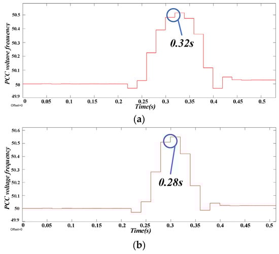 PCC voltage frequency waveforms: (a) Waveform using traditional AFD method; (b) Waveform using the improved AFD method.