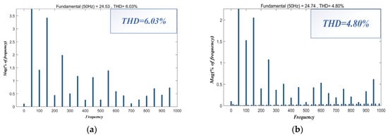 Figure 16 displays the total harmonic distortion (THD) of the current waveforms obtained by using the traditional islanding detection method and the AFDPF method, respectively. In Figure 16a, the THD of the current using the traditional Active Frequency Drift (AFD) method is 6.03%, while in Figure 16b, the THD obtained after applying the AFDPF method with positive feedback is 4.80%. Compared to the traditional AFD method, the improved method with positive feedback introduces less harmonic pollution to the microgrid.
