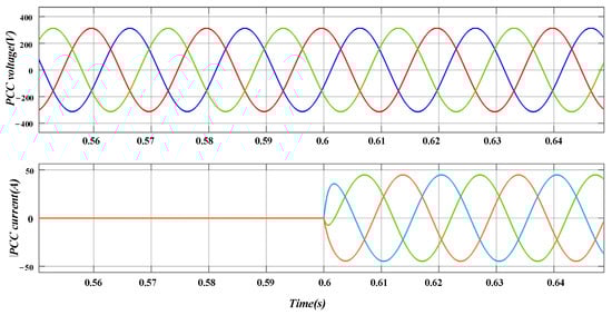 From the perspective of inrush current, any discrepancy in any voltage parameter at the PCC prior to grid connection with those of the main grid will result in , causing a load impact. A seamless transition, characterized by the absence of inrush current upon switching, occurs only when , , where represents the angular frequency, represents the phase angle, denotes the voltage of the distributed generation system, and signifies the grid voltage. Under these conditions, a smooth switchover can be achieved.