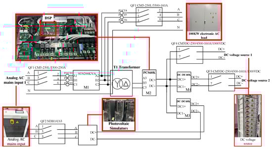 To validate the effectiveness of the seamless grid-connected/off-grid switching control strategy, a typical control system comprising a photovoltaic (PV) simulator, a Power Conversion System (PCS), and commercial electricity was employed for experimentation. Figure 18 illustrates the system configuration and electrical schematic. The PCS utilized in this setup has a rated power of 100 kW, with the control chip being the TMS320F28378DPTPS model. An electronic load was used to simulate AC loads, with a rated power of 100 kW. The AC/DC converter operated with rated grid-connected voltage of 400 V (ranging from 320 V to 460 V), a rated grid-connected frequency of 50 Hz (ranging from 47.5 Hz to 51.5 Hz), and a rated off-grid voltage of 380 V/400 V (ranging from 360 V to 420 V).