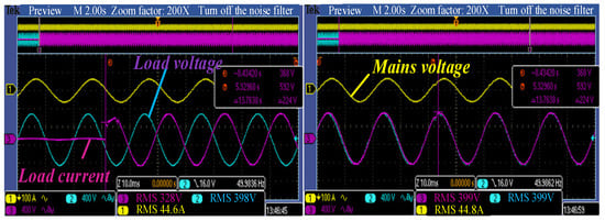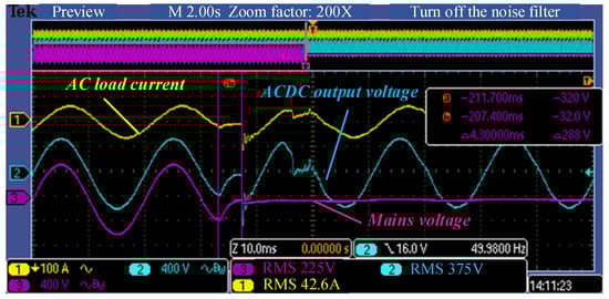 After the system is connected to the load and operates in off-grid mode, during the operation, it switches from grid-connected mode to off-grid mode. Once the switch is closed, the proposed improved pre-synchronization control strategy is implemented to achieve tracking of frequency, phase, and amplitude for pre-synchronization. After the pre-synchronization is completed, the system enters grid-connected mode. The single-phase mains voltage, load-side voltage, and mains input current are connected to an oscilloscope to observe the waveform diagram, as shown in Figure 20.