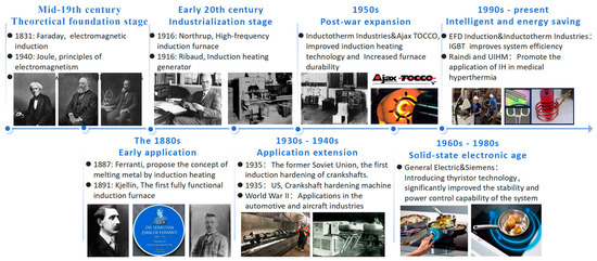 Induction heating technology, based on the principle of electromagnetic induction discovered by Michael Faraday in 1831 [4], advanced significantly throughout the 20th century [5]. It was initially used to melt metals in the late 19th century, with Sebastian Z. de Ferranti and F.A. Kjellin making significant contributions [6]. Edwin F. Northrup invented the world’s first high-frequency induction furnace in 1916, marking the technology’s entry into the industrial stage [7]. The Second World War to the 1950s saw wide industrial use of induction heating, followed by its application in the automotive industry to strengthen components [8]. From the 1960s to the 1980s, the technology underwent another revolution with the introduction of thyristor and semiconductor technology [9]. Then, from the 1990s, induction heating developed in the directions of intelligence and energy saving, with the application of insulated gate bipolar transistors (IGBTs) improving system efficiency and stability [10]. Companies like EFD Induction and Inductotherm Industries promoted its use in new energy equipment manufacturing and high-precision machining [11]. The technology is also being applied in the medical field, promoted by companies such as Raindi and UIHM [12]. The development course of induction heating technology is depicted as shown in Figure 3.