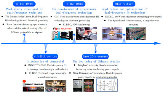 Since the 1950s, DFIH technology has undergone rapid development, as illustrated in Figure 6. Soviet scientists demonstrated the broad potential of this technology in metal processing by using low-frequency and high-frequency currents to heat different parts of a workpiece, thereby creating differential hardening layers [30]. In the mid-20th century, INDUCTOHEAT, an American company, developed and commercialized a dual-frequency induction hardening technology based on a single-turn inductor [8]. Subsequently, ELDEC, a German company, employed two power supply systems to heat workpieces at different frequencies, achieving uniform heating across various regions of the workpiece and enhancing production efficiency. In the 1980s, General Motors (GM) introduced asynchronous DFIH technology, using two power sources with different frequencies for segmented heating. This replaced traditional carburizing and nitriding quenching processes, reducing processing time and costs. Later, the introduction of Simultaneous Dual-Frequency (SDF®) technology by German company ELDEC marked another significant advancement in simultaneous dual-frequency heating. This technology incorporates both low-frequency and high-frequency currents within a single inductor, enabling rapid and uniform heating of workpieces along with efficient quenching [2].