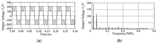 Simulation waveforms of output voltage for NPC H-bridge inverter: (a) graph of output voltage over time; (b) graph of output voltage vs. frequency.