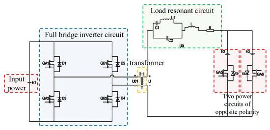 The multi-inverter bridge structure effectively enhances the power density of the system by enabling the parallel operation of multiple inverters. As indicated in Reference [44], this structure not only distributes current load but also simultaneously outputs high- and low-frequency currents, thereby improving power output density. The 2T1C and 3T resonant inverter topologies proposed by Frania et al. [23], through the design of multiple-inverter bridges, effectively increased the system’s power density, with experimental efficiency exceeding 97%. Reference [46] mentions a DFIH power supply that utilizes a single-phase full-bridge inverter circuit, which optimizes power density and achieves the superposition of low- and high-frequency signals by adjusting its operating frequency. This design maintains a stable dual-frequency signal output under high power density requirements, making it suitable for large-scale industrial applications.
