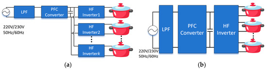 - Papani, S.K.; Neti, V.; Murthy, B.K. Dual frequency inverter configuration for multiple-load induction cooking application. IET Power Electron. 2015, 8, 591–601. [Google Scholar] [CrossRef]