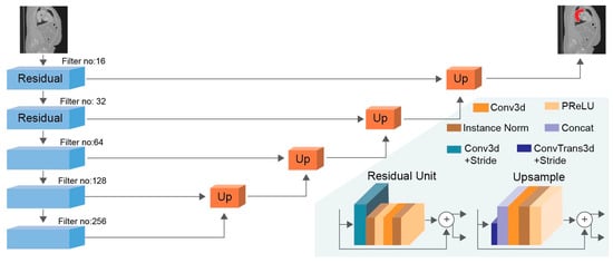 Briefly, the UNet structure consists of an encoder part which is responsible for the extraction of features with context information and a decoder part which can reconstruct the segmentation mask in the full resolution [34]. The encoder (contractive path) incorporates convolutional blocks including convolutions, the ReLU activation function, and max pooling layers to down-sample the feature maps by 2, while doubling the number of features in each stage. In this work, we additionally included residual connections inside the convolutional blocks of the encoder and decoder to facilitate gradient propagation. In this regard, each encoder block included two convolutional layers, the first with stride 2 to down-sample the feature map, followed by instance normalization and the PReLU activation function. The number of convolutional filters for the 5 layers of the encoder were set to (16, 32, 64, 128, 256). The final layer of the encoder was the bottleneck layer between the encoder and decoder path. In each stage of the decoder, the feature maps from the previous stage were up-sampled by 2 through transpose convolutions and then concatenated with the feature maps from the corresponding encoder stage connected with the skip connection. In detail, in each decoder block, the up-sampled features were concatenated with the features from the skip connection along the channel dimension, then they pass through a convolutional layer, instance normalization, and the PReLU activation function. Finally, the residual connection adds the concatenated input to the PReLU output to shape the final output of the corresponding decoder layer. The final convolutional layer was followed by a softmax activation function to produce the segmentation mask in full resolution. The architectural design of UNet is presented in Figure 1, while its hyperparameters are listed in Table 1.
