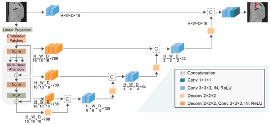 The UNETR model combines the UNet-like architecture composed of the encoder for feature extraction and the decoder for the segmentation reconstruction with the transformer network [35]. The conventional convolutional encoder is replaced with a transformer that is capable of modeling large spatial dependencies. Skip connections are implemented to transfer information from the encoder to different resolutions in the decoder. In this study, the encoder of UNETR was built upon a vision transformer (ViT), which requires splitting the input image into patches of fixed size. These non-overlapping 3D patches were then flattened to create one-dimensional vectors, xv, that would be used as input to the ViT. In the next step, a linear layer was applied to transform the patches into vectors with a lower dimension of size K. In the created vectors, a 1D learnable positional embedding was added to retain the initial spatial details leading to the final embeddings z that will be inserted into the ViT. The generation of embeddings is followed by a sequence of transformer blocks incorporating multi-head self-attention (MSA) and multi-layer perceptrons (MLP). At layers 3, 6, 9, and 12 of the transformer, sequence representations were extracted. These layers correspond to different resolutions in the encoder, capturing different levels of feature abstraction. The sequence representations extracted from the encoder are initially in the form of 1D patch embeddings. Then, the embeddings were reshaped into a 3D tensor of the required dimension for the decoder. The reshaped tensors from the encoder are fed directly into the decoder through skip connections. At the bottleneck layer, a transposed convolution was applied to increase the spatial resolution of the output of the last transformer layer by a factor of 2. Then, the resized feature map was concatenated with the one from the previous transformer output. The decoder in UNETR comprised convolutional layers, as well as an instance normalization (IN) process, designed to gradually up-sample the encoded representations back to the original image resolution. The skip connections merged features from different transformer layers with corresponding levels of the decoder, preserving spatial details. At each stage, the reshaped tensors are processed by 3 × 3 × 3 convolutional layers followed by normalization, ensuring a smooth transition from the embedding space to the input space. In the output layer, a 1 × 1 × 1 convolution produced the segmentation map. The architectural design of UNETR is presented in Figure 2, while its hyperparameters are listed in Table 1.