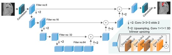SegResNet follows the UNet structure with the encoder, the bottleneck, and the decoder part [37]. The variational auto-encoder part of the decoder is omitted to reduce computational cost [38]. The encoder path is composed of convolutional ResNet blocks that include residual connections to mitigate the vanishing gradient problem. Each encoder block comprises two convolutional blocks, which include a group normalization, ReLU activation, and 3D convolution, with a skip connection to aid in gradient propagation. In this study, in the encoder path, each encoder block would double the number of filters and down-sample the input feature maps by 2, using convolutions with stride 2, in order to capture the context of the image in various levels of abstraction. A bottleneck layer consisting of 256 filters was located between the encoder and the decoder part. The decoder module reconstructed the segmentation mask by gradually up-scaling the feature representation from the different levels of the encoder. In each decoder block, the feature maps from the previous level of the decoder (which were up-sampled by 2 using a transpose convolution), were added to the feature maps from the corresponding skip connection and inserted into 1 × 1 × 1 convolutions to refine the number of features. In contrast to the encoder blocks, decoder blocks included one convolutional layer per block. The last layer applied a softmax activation function with 2 channels for the final segmentation mask. The architectural design of SegResNet is presented in Figure 4, while its hyperparameters are listed in Table 1.