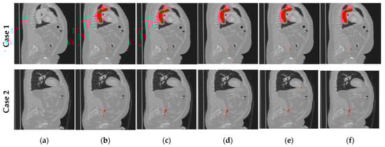 Detected regions of interest (aorta) superimposed on the original imaging data slices for two clinical cases (row 1 and 2) of the public dataset for (a) the initial image; (b) ground truth; (c) UNet model; (d) UNETR model; (e) SwinUNETR model; and (f) SegResNet.