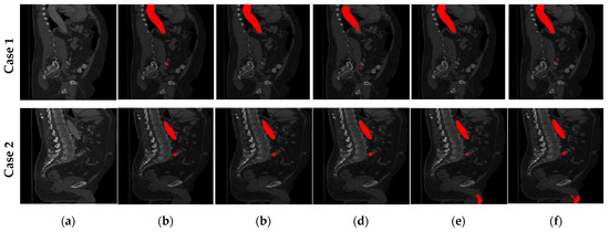 For the qualitative evaluation of the four deep learning architectures, the detected aortic structure was superimposed on the original image (and the golden standard) in each case. As mentioned in the previous sections, the golden standard was a mask of the actual abdominal aorta defined by experts manually (utilizing the 3D Slicer application). Representative examples are shown in Figure 5 and Figure 6 (for the private and public datasets, respectively), where the segmented region of interest is highlighted in red for visualization purposes.