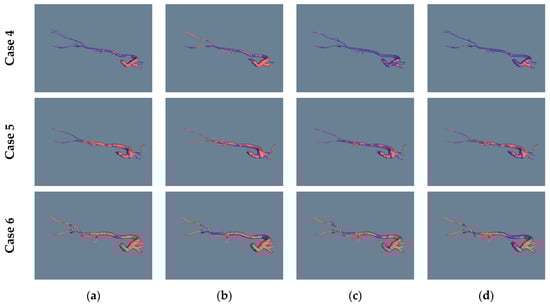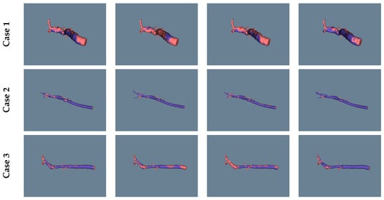 Three-dimensional fused models of the estimated aorta (blue) superimposed on the ground truth (coral) for three cases, using (a) UNet; (b) UNETR; (c) SwinUNETR; and (d) SegResNet.