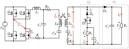 In this configuration, Lt, Lp, and Ls represent the compensation inductor, the transmitting coil, and the receiving coil, respectively, while Rt, Rp, and Rs denote the parasitic resistances of Lt, Lp, and Ls, respectively. Furthermore, Ct, Cp, and Cs are the compensating capacitors. Specifically, Diode D1 is adopted to form a diode half-wave rectifier circuit for output channel #1, whereas Diode D2 is adopted to form a controllable half-wave rectifier circuit for output channel #2. In particular, the voltage of V1 is controlled by the primary inverter. And the control of the voltage V12 is realized by adjusting the conduction angle of the switching MOSFET Q1. Then, capacitors C1 and C2 serve as filter capacitors connected in parallel with loads R1 and R2, respectively. As a result, the double output loops are labeled as #1 and #2.