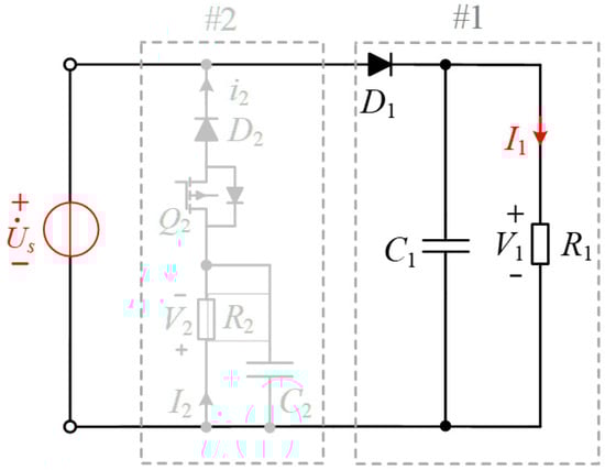 The proposed WPT design, utilizing dual rectification pathways, provides a scalable and efficient solution for stable dual-output power transfer within a compact framework. By integrating two distinct rectification techniques, the system achieves dual-output functionality, surpassing traditional full-bridge rectifiers in both performance and controllability. As shown in Figure 2, during the positive half-wave cycle of the receiving end, the designed circuit topology is capable of supplying power to load R1 via the diode half-wave rectification at the output channel #1. During this period, the output channel #1 is turned on while the output channel #2 is turned off, as illustrated in Figure 3. During the negative half-wave cycle of the receiving end, the system provides power to the load R2 via the controllable half-wave rectifier circuit. During the negative half-cycle, MOSFET Q1 is activated. The output channel #2 is turned on during this period while the output channel #1 is turned off, as illustrated in Figure 4. Then, following filtration by capacitors C1 and C2, it then flows through load R1 and R2 to deliver the dual-power outputs.