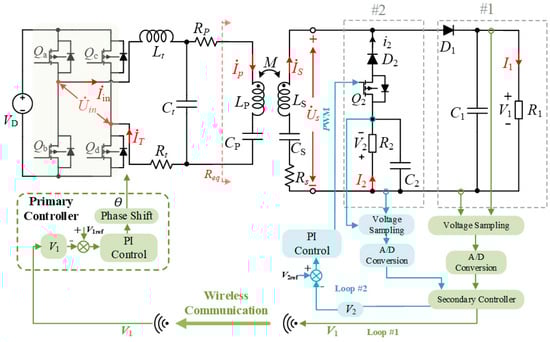 In this setup, the secondary-side controller first samples the voltage across R1 and transmits the voltage signal to the primary side via communication modules, such as antennas. Upon receiving the feedback signal V1back, the primary-side controller compares it to the reference voltage V1ref, producing an error signal, which is then processed by the primary-side PI controller. The controller calculates the appropriate phase shift angle θ based on this error and sends it to the full-bridge inverter. By adjusting the phase shift, the inverter modifies the system’s input voltage Uin accordingly. The adjusted Uin influences the double-output WPT system, subsequently altering the voltage V1 across R1. This closed-loop feedback process enables constant voltage control of V1, ensuring stable and reliable output in response to variations in load or system conditions.