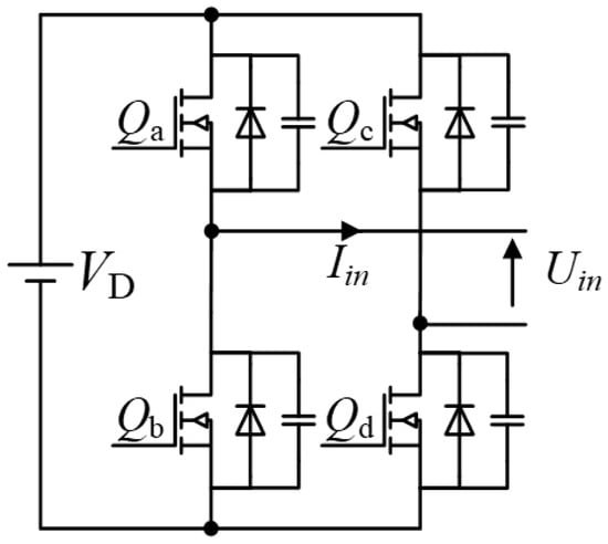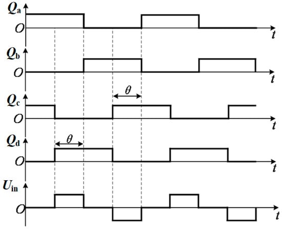 Firstly, the outer loop, designated as Loop #1, primarily regulates the output voltage V1 by adjusting the input voltage Uin. Common methods for controlling Uin by the phase-shift control. Figure 6 illustrates the circuit configuration of the full-bridge inverter, accompanied by a timing diagram representing the phase-shift process. MOSFETs Qa and Qb operate in a complementary conduction state, as do Qc and Qd, as shown in Figure 7. When phase-shift control is applied, a phase-shift angle θ is introduced between the two bridge arms []. In the proposed method, maintaining in-phase voltage and current from the inverter ensures the zero phase angle (ZPA).
