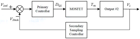 The inner loops, designated as Loop #2, primarily regulate the output voltage V2 by adjusting the conduction time of the switching elements within each respective loop. The control scheme block diagram for Loop #B is presented in Figure 9. For constant voltage control within this loop, the secondary-side controller first samples the output voltage V2, comparing it to predefined reference values within the controller. The resulting error signals are processed by a PI controller, which then generates control signals for the drivers of the corresponding switching elements in this loop. The control signal, represented as duty ratio DQ2, determines the conduction times Ton of the switch. By modulating this conduction time, the system can effectively adjust the output voltages V2, achieving stable, constant voltage control for each output. This approach ensures precise voltage regulation across multiple output channels, contributing to the system’s overall reliability and performance in varied load conditions.