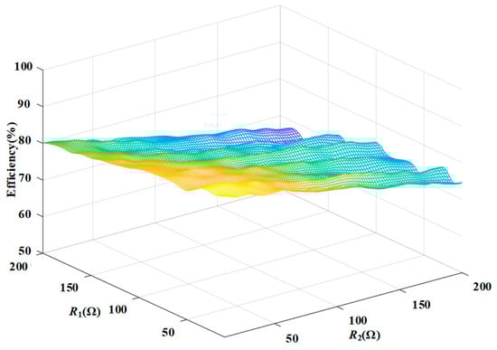 Figure 11 illustrates the efficiency profile of the presented WPT system under varying load conditions, specifically across an extended resistance range for R1 and R2 from 5 Ω to 200 Ω. The three-dimensional surface plot highlights the variations in efficiency across the load range, with efficiency values dynamically influenced by the resistances of R1 and R2. The maximum efficiency achieved is 88.86%, while the minimum efficiency is 64.51%, indicating a promising power transfer capability in the proposed configuration.