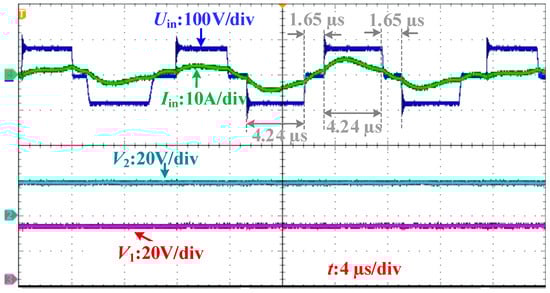 Figure 12 shows the oscilloscope waveform of the voltage and current characteristics of the proposed double-output WPT system. The output voltage of the inverter (Uin) is presented at a scale of 100 V per division, while the output current of the inverter (Iin) is depicted with a scale of 10 A per division. The output voltages (V1 and V2) for two channels are captured at 20 V per division each, clearly representing the system’s electrical behavior under the given load conditions. In this figure, Uin and Iin are in the same phase, indicating that the entire system can realize ZPA in the system. Primarily, this figure includes detailed information on the switching period (11.78 μs), rise time (1.65 μs), and fall time (1.65 μs).