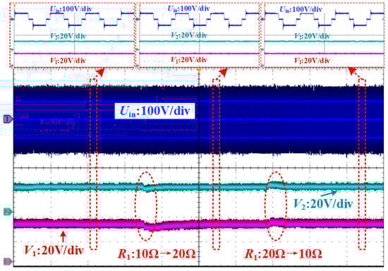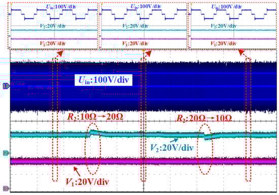 Figure 13 presents the effect of changing load conditions for channel #1 (R1) on the proposed double-output WPT system. The input voltage (Uin) is represented with a scale of 100 V per division, while the output voltages (V1 and V2) are shown at 20 V per division. In this figure, the load R1 varies between 10 Ω and 20 Ω, with the changes indicated by the dashed red lines. This demonstrates the load-independence of the outputs. After the slight ripples, the output becomes reference values again. It shows the load-independent characteristics of the proposed system, making it better suited for practical applications where independent and stable power delivery to multiple loads is required.