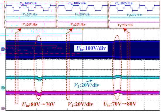 Figure 15 shows the response of the proposed double-output WPT system to changes in the input voltage Uin. The input voltage is depicted with a scale of 100 V per division, while the output voltages for Channel #1 (V1) and Channel #2 (V2) are shown at 20 V per division. In this figure, the input voltage Uin is adjusted in steps between 80 V, 70 V, and back to 80 V, with these variations marked by dashed red lines. This figure highlights the stability of the output voltages on the input power supply, emphasizing the importance of regulated control to maintain reliable outputs for both channels.