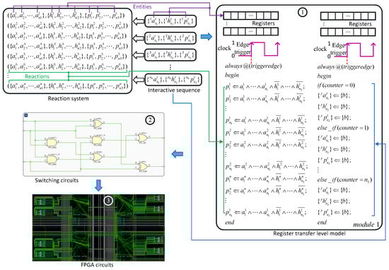 On the foundation of investigations above, the reaction system FPGA implementation method, abbreviated as RSFIM, is proposed. RSFIM, illustrated in Figure 1, has three steps: (1) use 1-bit registers to represent entities and assign 1 s or 0 s to them, indicating entity presence and absence; (2) transform reactions of the target reaction system into logic expressions; (3) set one FPGA clock cycle as one interactive process step, introducing entities according to a step counter into the system to imitate the interactive process.