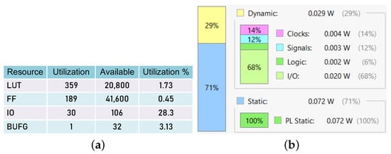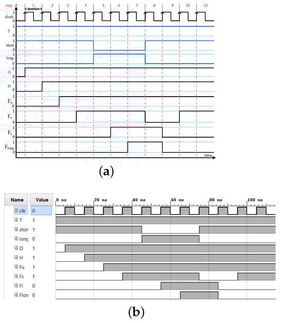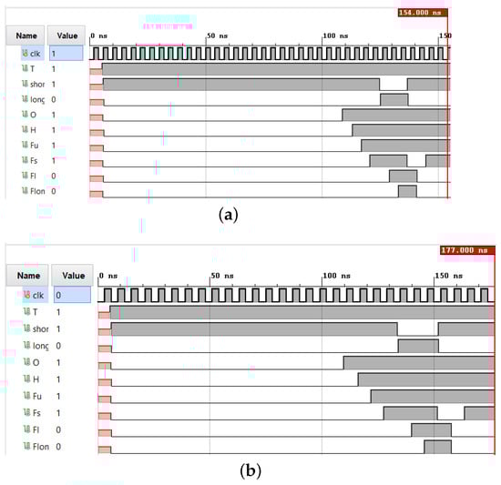 Post-implementation timing simulation is a significant procedure to evaluate the performance of a designed model because gate delays and data path delays are considered. It is noted that during simulations, the clock period is defined by setting the half period, and real numbers are rounded to the nearest integers. This means if the clock period is an odd number, the actual clock is 1 ns longer for the 0.5 is rounded to 1. This is the case for the implementation of because the clock period is 5 ns. To assess the performance, two post-implementation timing simulations with 4 ns and 6 ns as clock periods are carried out, shown in Figure 6. The mean integer value, 166 ns, is used as the elapsed time for 11 steps of . A 5 ns clock period implies that the computation speed is steps per second, and its corresponding frequency is 200 MHz. Computing logic expressions composed of 1-bit variables is very efficient compared with arithmetic expressions involving multiple-bit variables.