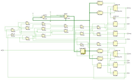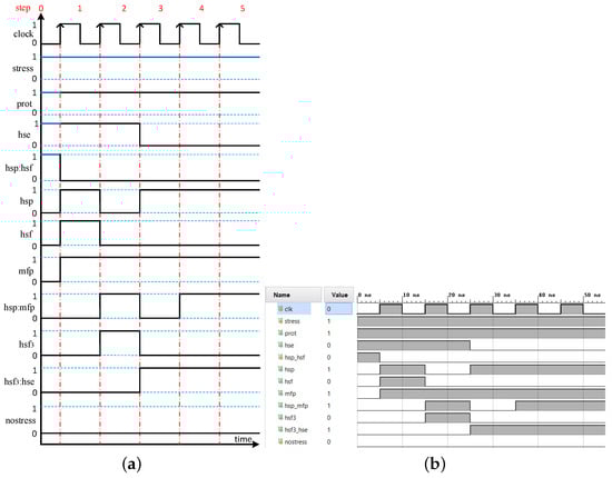 A heat shock response reaction system, is proposed in [], where constitutes of entities in Table 5 and consists of reactions in the same table. The interactive processes without temperature stress (at 37 °C) and with temperature stress (at 42 °C) are listed in Table 6 and Table 7, respectively. with the two interactive processes is modeled as two distinct RTL models, and , for their input/output ports are a little different []. The visual illustration of RTL logic for the heat shock response reaction system defined in Table 5 with the interactive process defined in Table 7 is given in Figure 8.