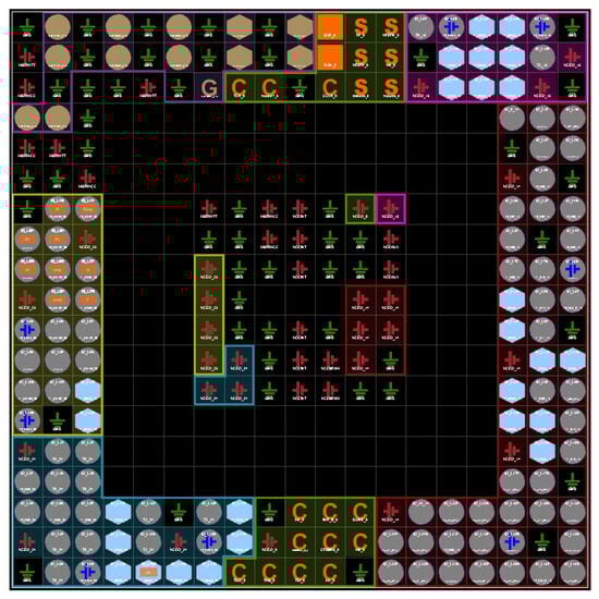Physical constraints setting of . Gray circles with wide orange bars are pins allocated to RTL model ports. The blue hexagon at bottom left with an orange bar inside is the clock pin.